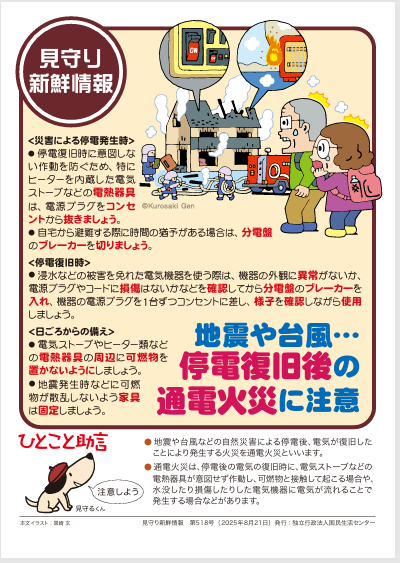 地震や台風など停電復旧後の通電火災に注意です!!