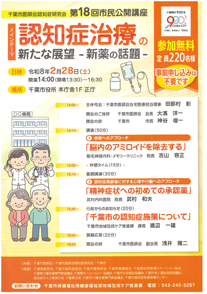 千葉市医師会認知症研究会にて『認知症治療の新たな展望』新薬の話題の講演会が行われます。